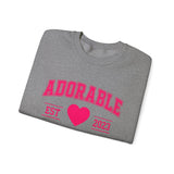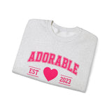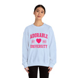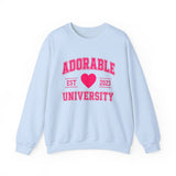 White crewneck sweatshirt with 'ADORABLE UNIVERSITY EST 2023' printed in pink on the front.