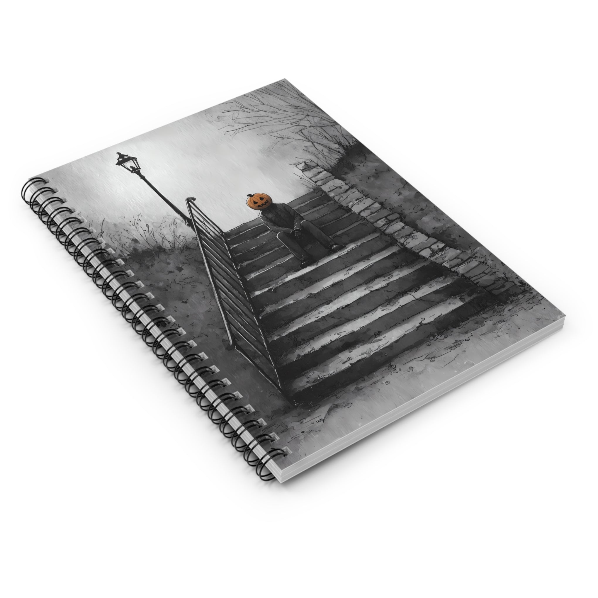 When the mornings get chilly and the leaves start to turn, a mysterious figure emerges. Elm Ridge has always had its fair share of interesting characters and urban legends, none more bizarre than October Man. A lanky individual draped in shadow, with the head of a jack-o-lantern. Motives unclear and origins unknown, he is said to roam west of the 'tracks, including Memorial Park. This fall-themed fantasy art notebook captures the spooky energy of this modern day fable.